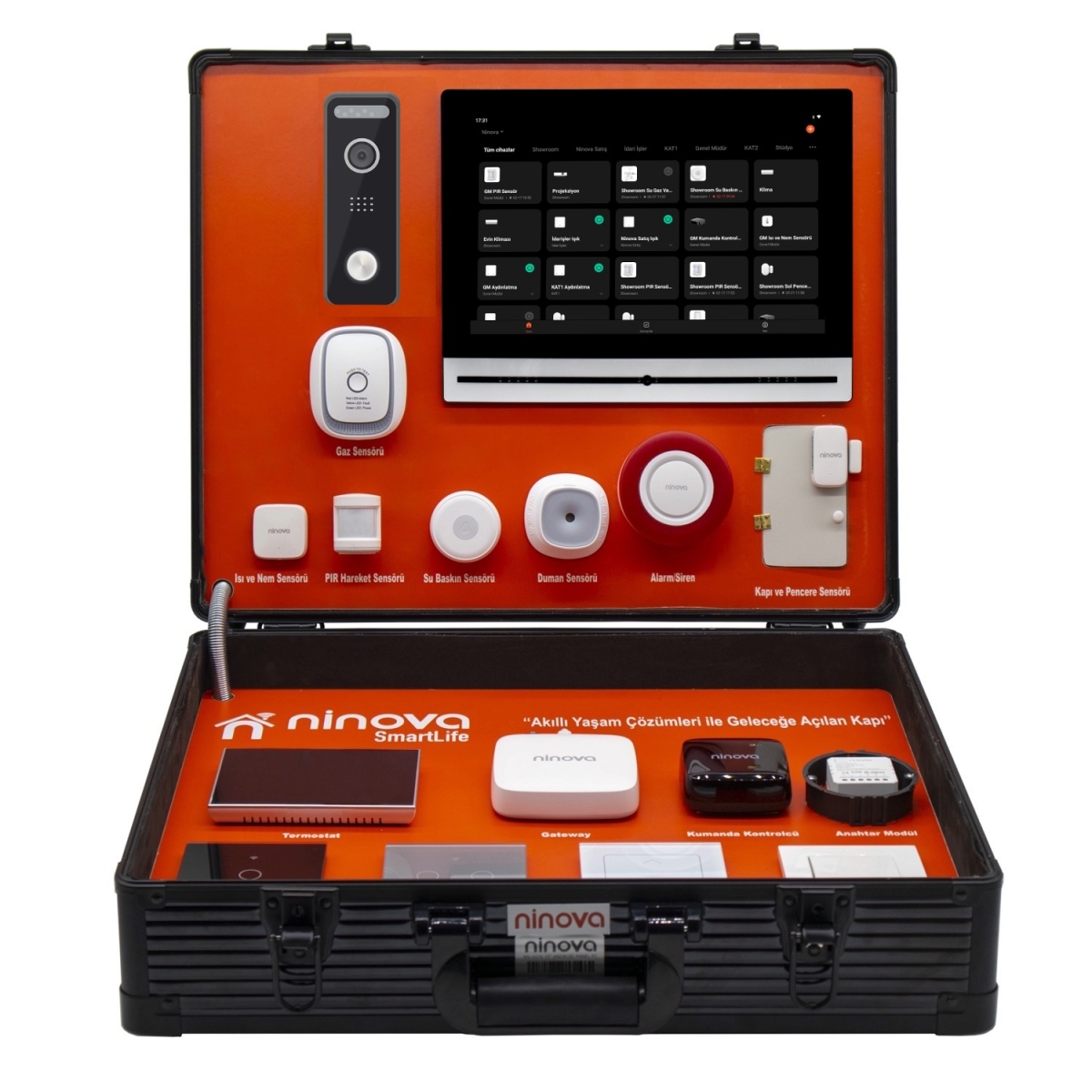Ürün Tanımı: Ninova Akıllı Ev Demo Çantası, akıllı ev teknolojilerini deneyimlemenizi sağlayan kapsamlı bir ürün setidir. Bu demo çantası, ev otomasyon sisteminizin tüm yönlerini keşfetmenize olanak tanır. İçerisinde gateway, akıllı ekranlı termostat, gaz, duman, su baskını sensörleri gibi bir dizi akıllı cihaz bulunmaktadır.